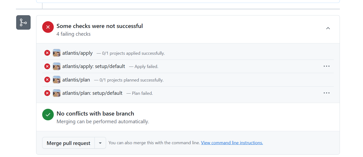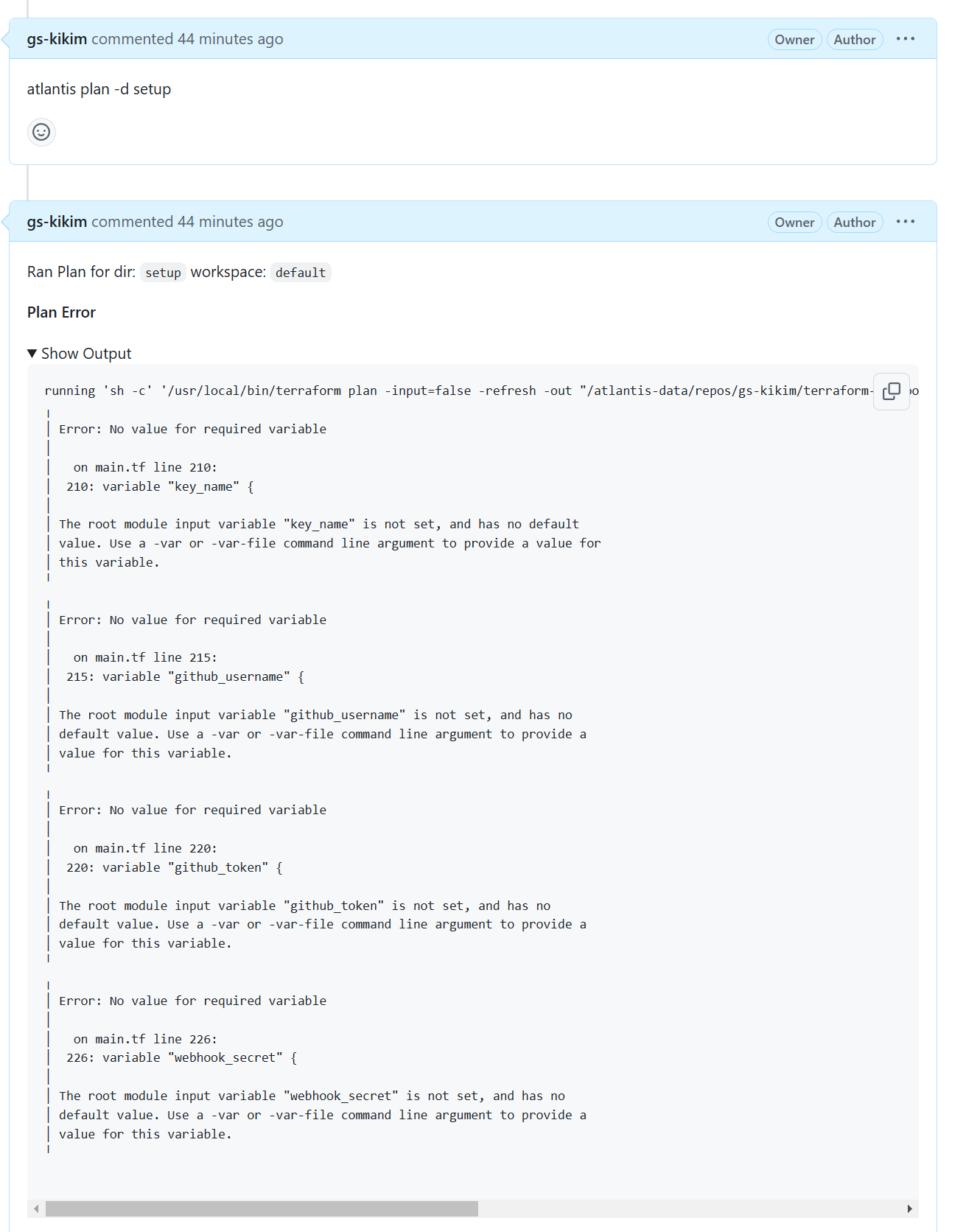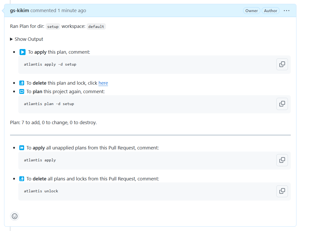 PR이 생성되면 코멘트 섹션에서 Atlantis 명령을 실행합니다: