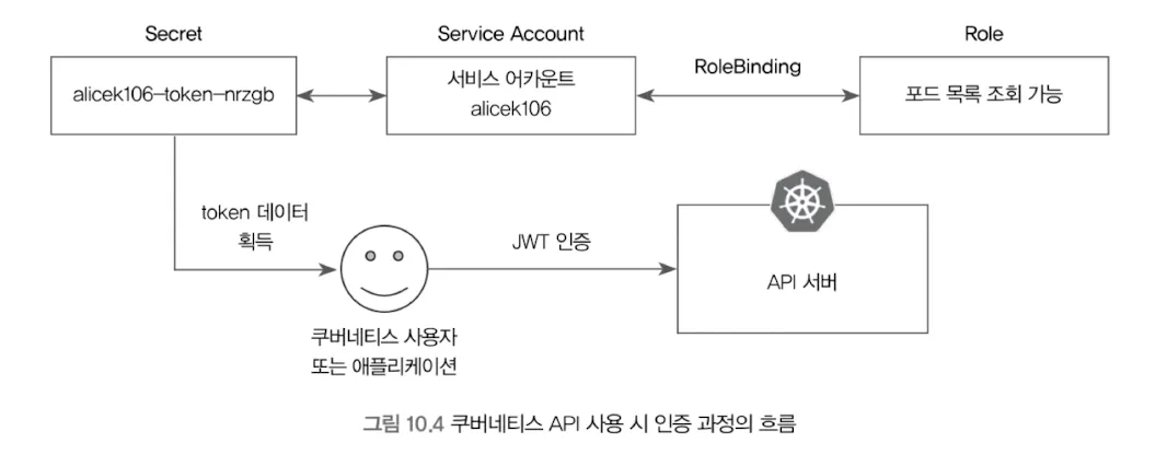 - 토큰 검증: API 서버는 토큰을 검증하고, 요청이 특정 서비스 어카운트(예: alicek106)에서 왔음을 확인합니다.