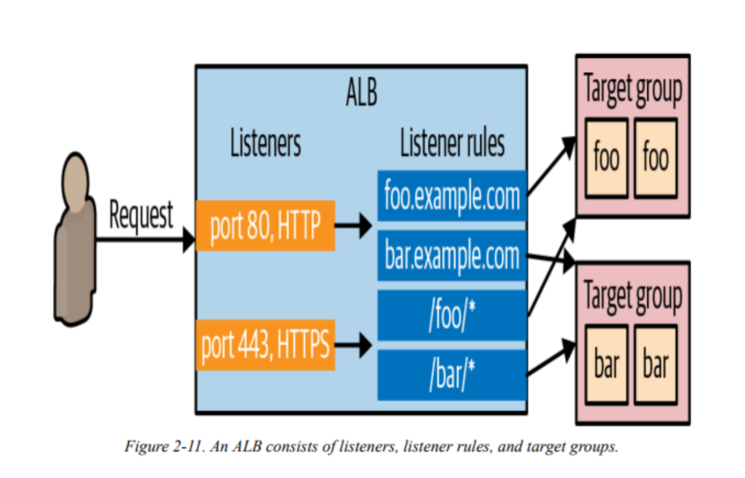 - 리스너에 들어오는 요청을 가져와 /foo 및 /bar 같은 특정 경로나 foo.example.com 및 bar.example.com 같은 호스트 이름과 일치하는 요청을 특정 대상 그룹으로 보냅니다.